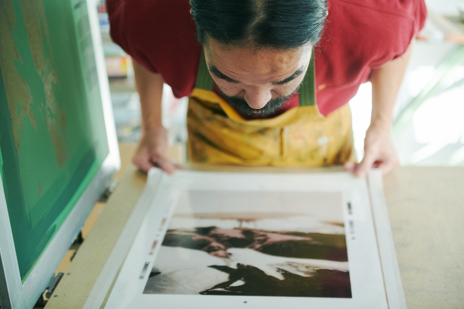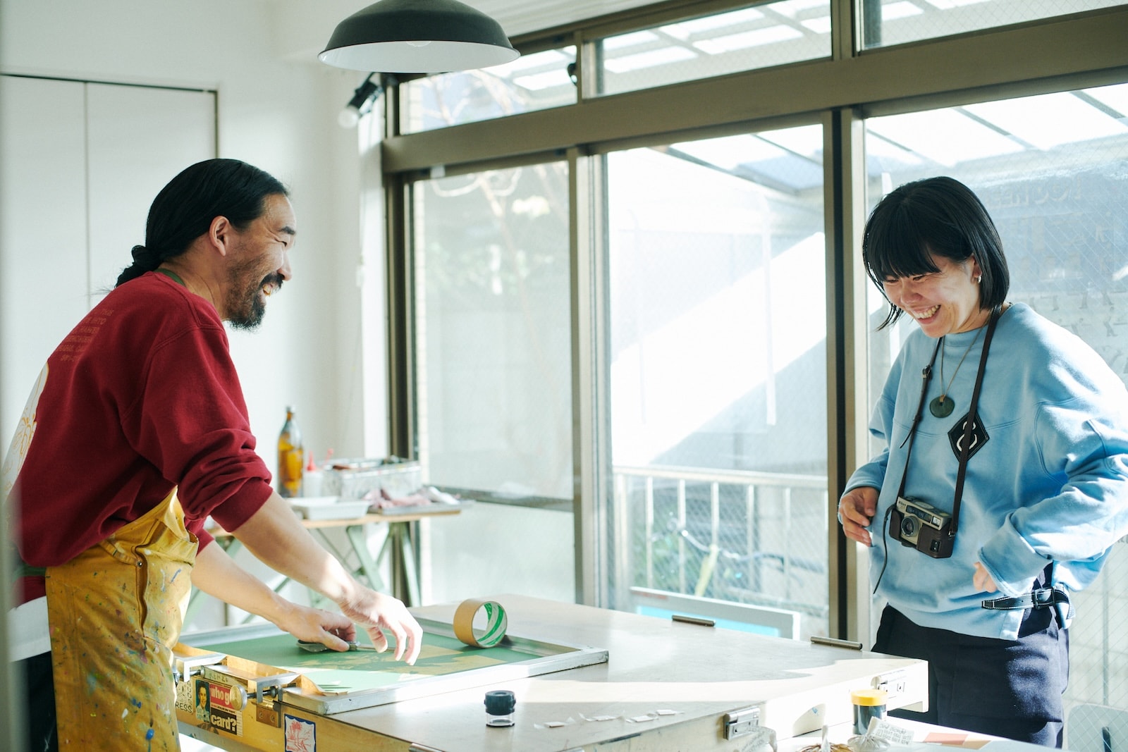 本多伸二さんのアトリエを訪ねた根本さん。本多さんはグラフィックデザイナーとして活躍しながらも、シルクスクリーンのプリンターとして、ご自身がデザインしたモチーフや身近で活動するアーティストの作品のプリントを手がけ、シルクスクリーン作品の可能性を追求する