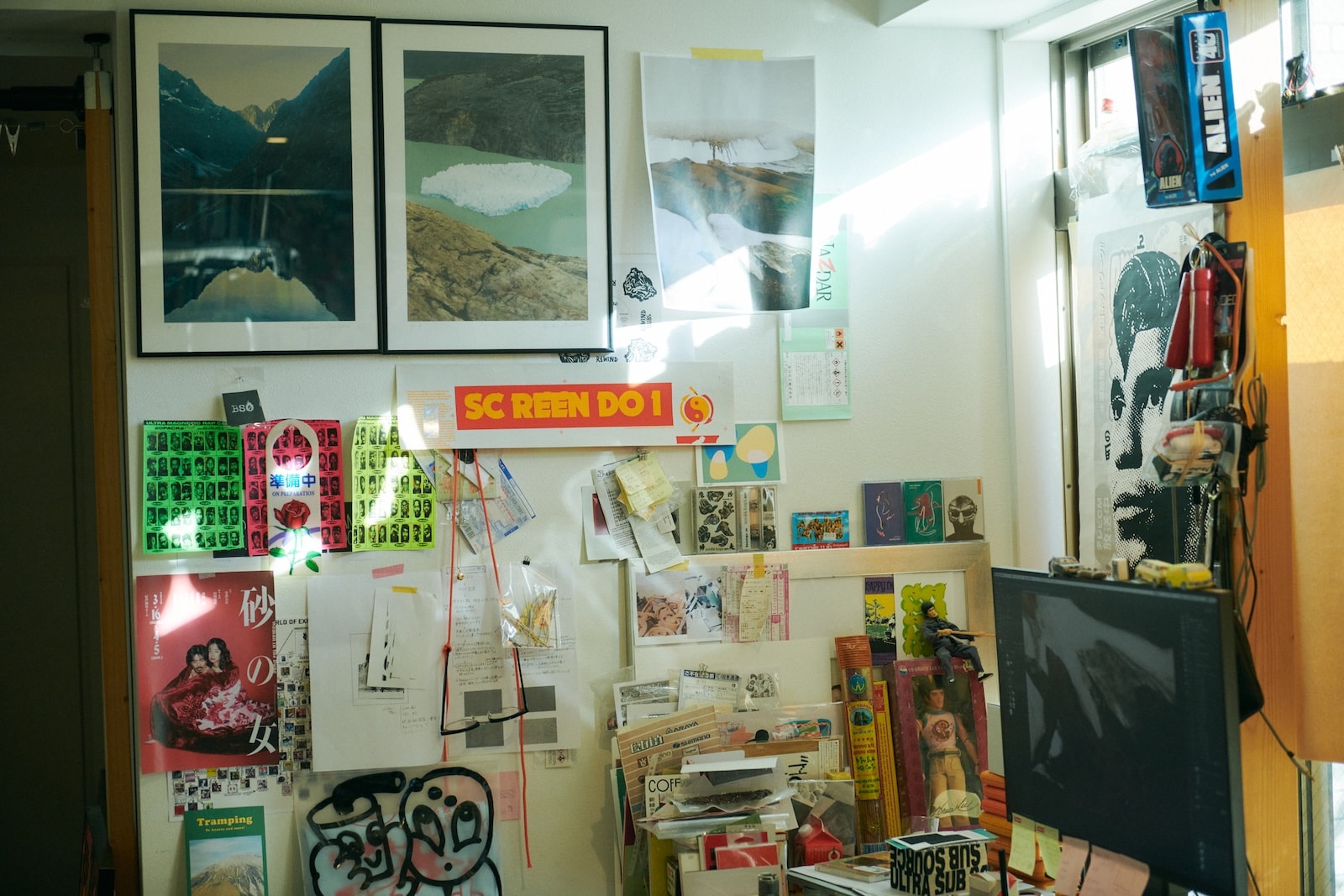 本多さんのアトリエ。壁には、根本さんと合作したシルクスクリーンプリント2作が額装して飾られていた。