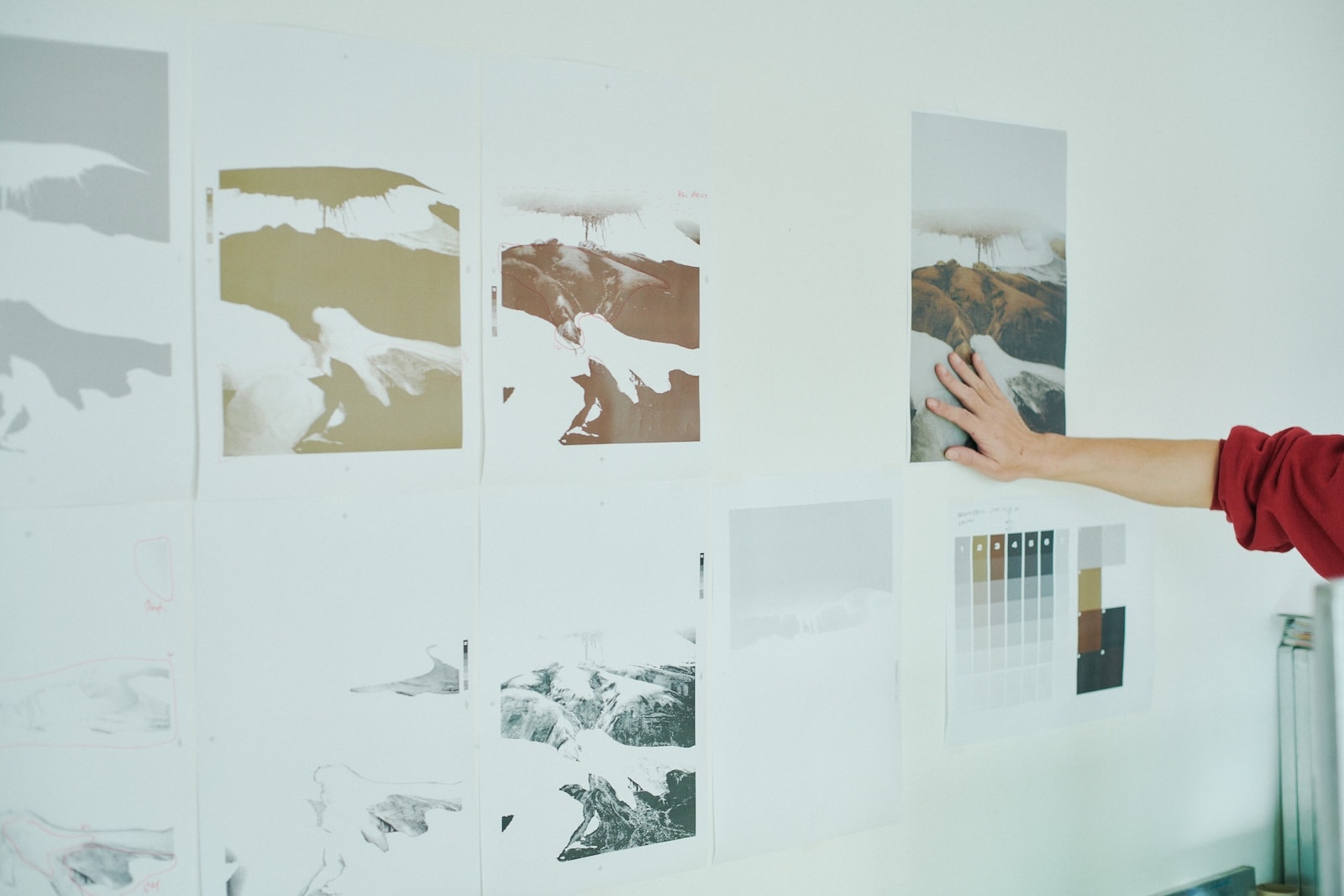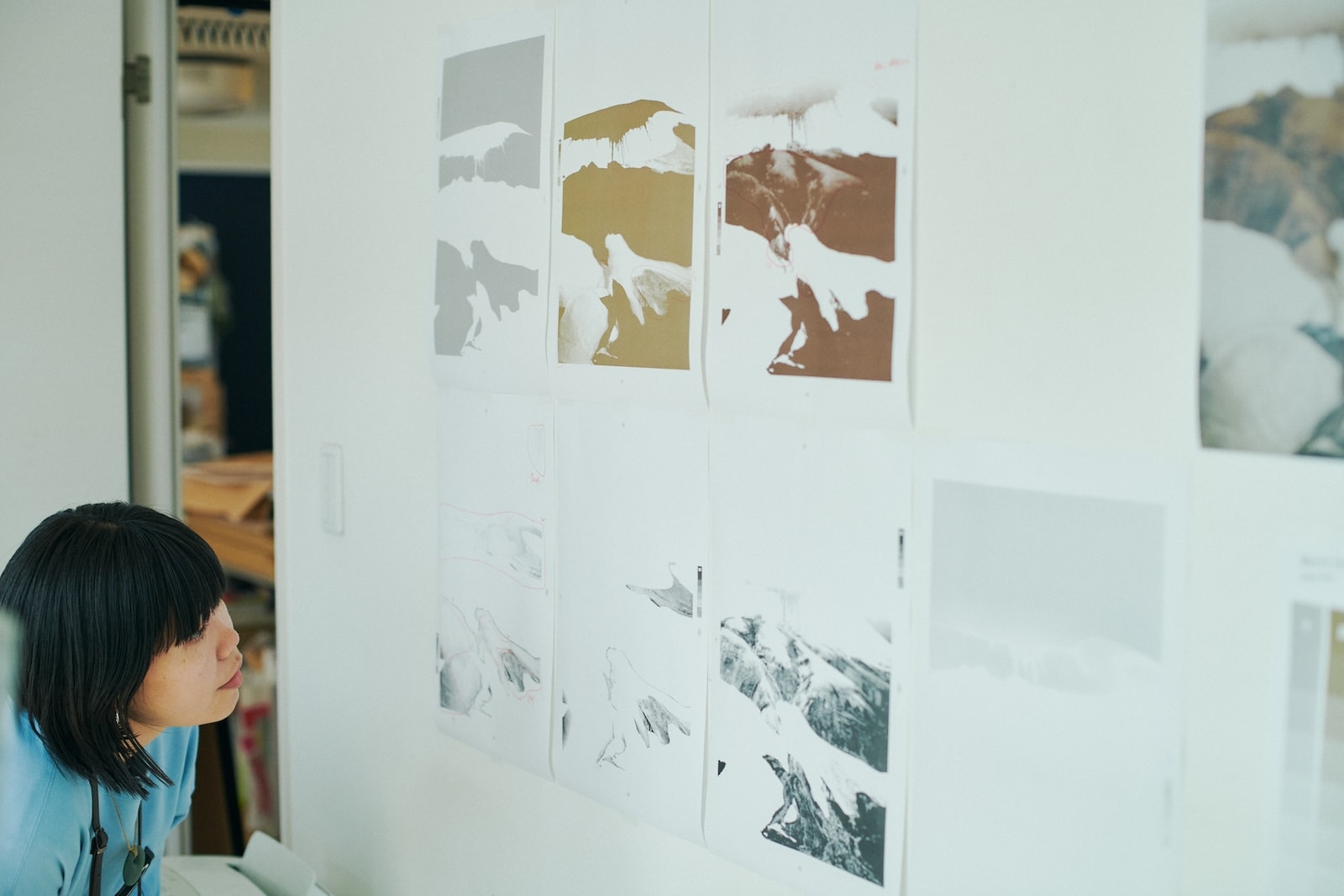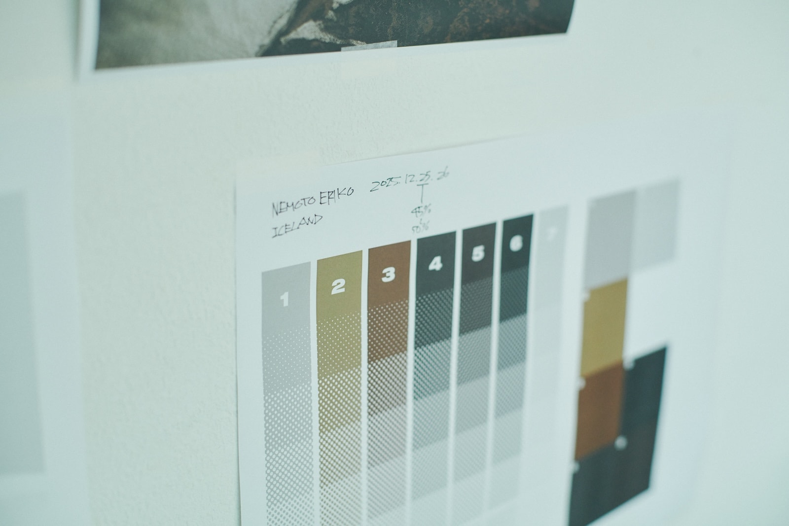 今回、本多さんがシルクスクリーンで表現してみたいと選んだのは、雪渓をところどころに残した丘陵の写真。これまでの2作は氷河や湖といったどこかみずみずしい要素があったが、荒涼たる風景というセレクトに「どうなるか楽しみ」と根本さん。壁に貼られた見本のように7版にわけ、灰色、黒色、黄土色、少しずつ色味の違う茶色〜赤茶色など、使用する塗料も本多さんがブレンドした。「この色をブレンドする工程が一番大変なんですよ。写真に忠実に色を再現するのではなく、僕の方で再編集しているというか。特に、根本さんの写真ってシンプルなようでいてどの色がいいのかっていうのは、なかなかすぐにはわからないんです」