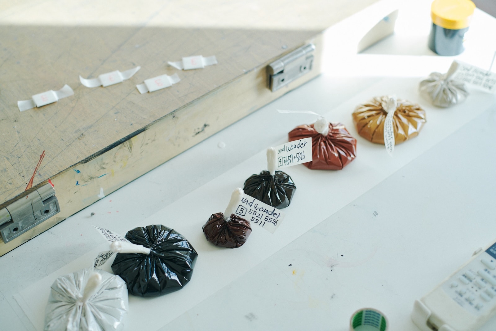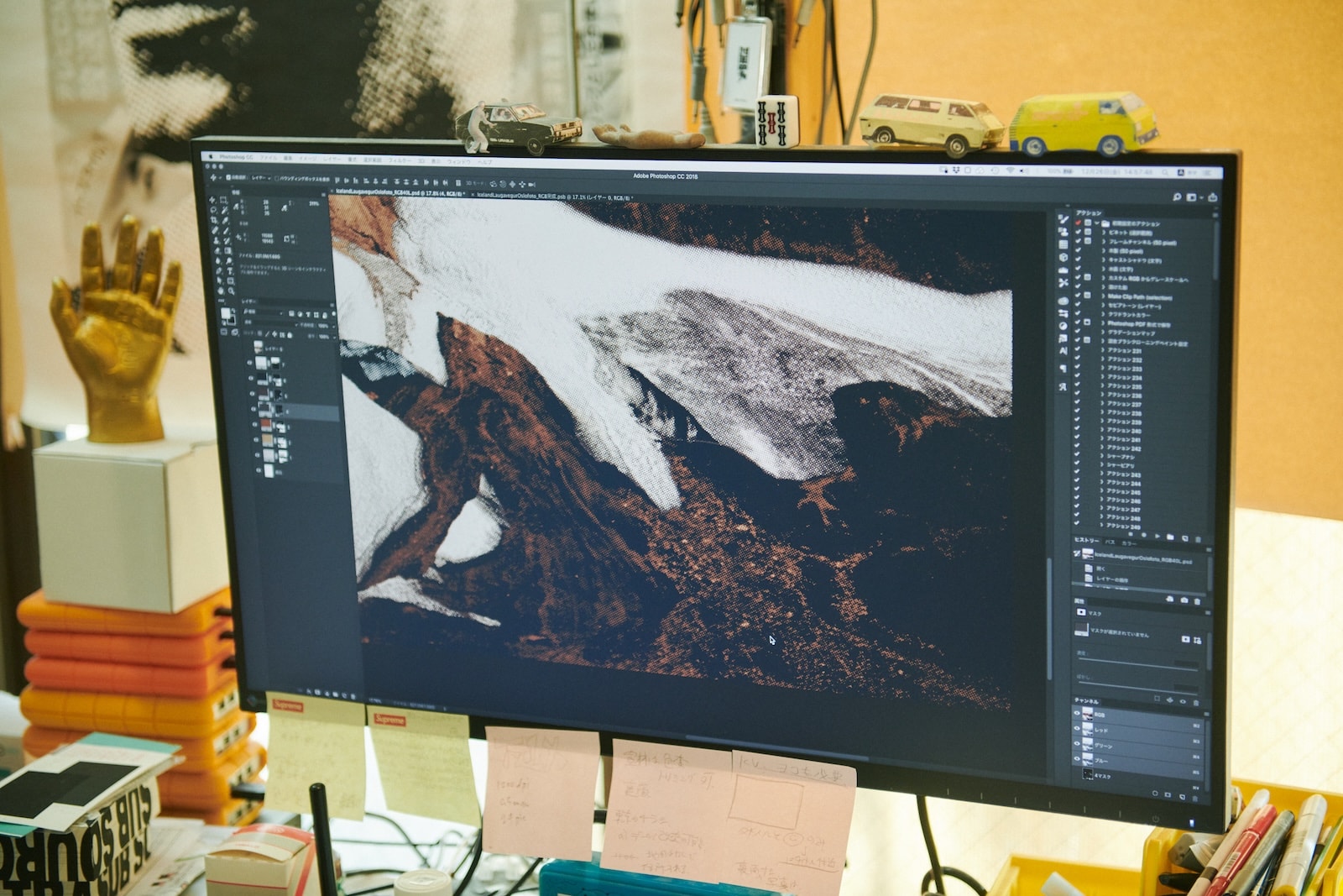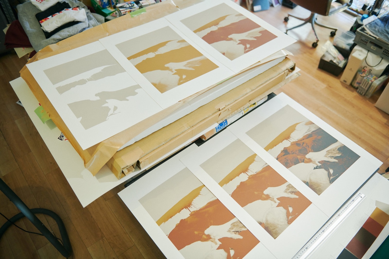 今回、本多さんがシルクスクリーンで表現してみたいと選んだのは、雪渓をところどころに残した丘陵の写真。これまでの2作は氷河や湖といったどこかみずみずしい要素があったが、荒涼たる風景というセレクトに「どうなるか楽しみ」と根本さん。壁に貼られた見本のように7版にわけ、灰色、黒色、黄土色、少しずつ色味の違う茶色〜赤茶色など、使用する塗料も本多さんがブレンドした。「この色をブレンドする工程が一番大変なんですよ。写真に忠実に色を再現するのではなく、僕の方で再編集しているというか。特に、根本さんの写真ってシンプルなようでいてどの色がいいのかっていうのは、なかなかすぐにはわからないんです」
