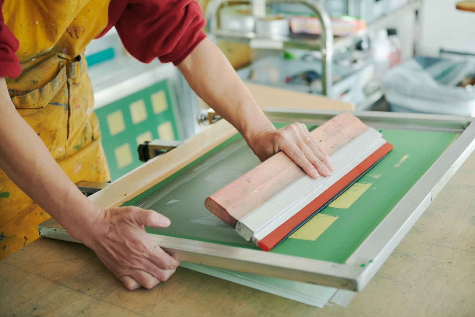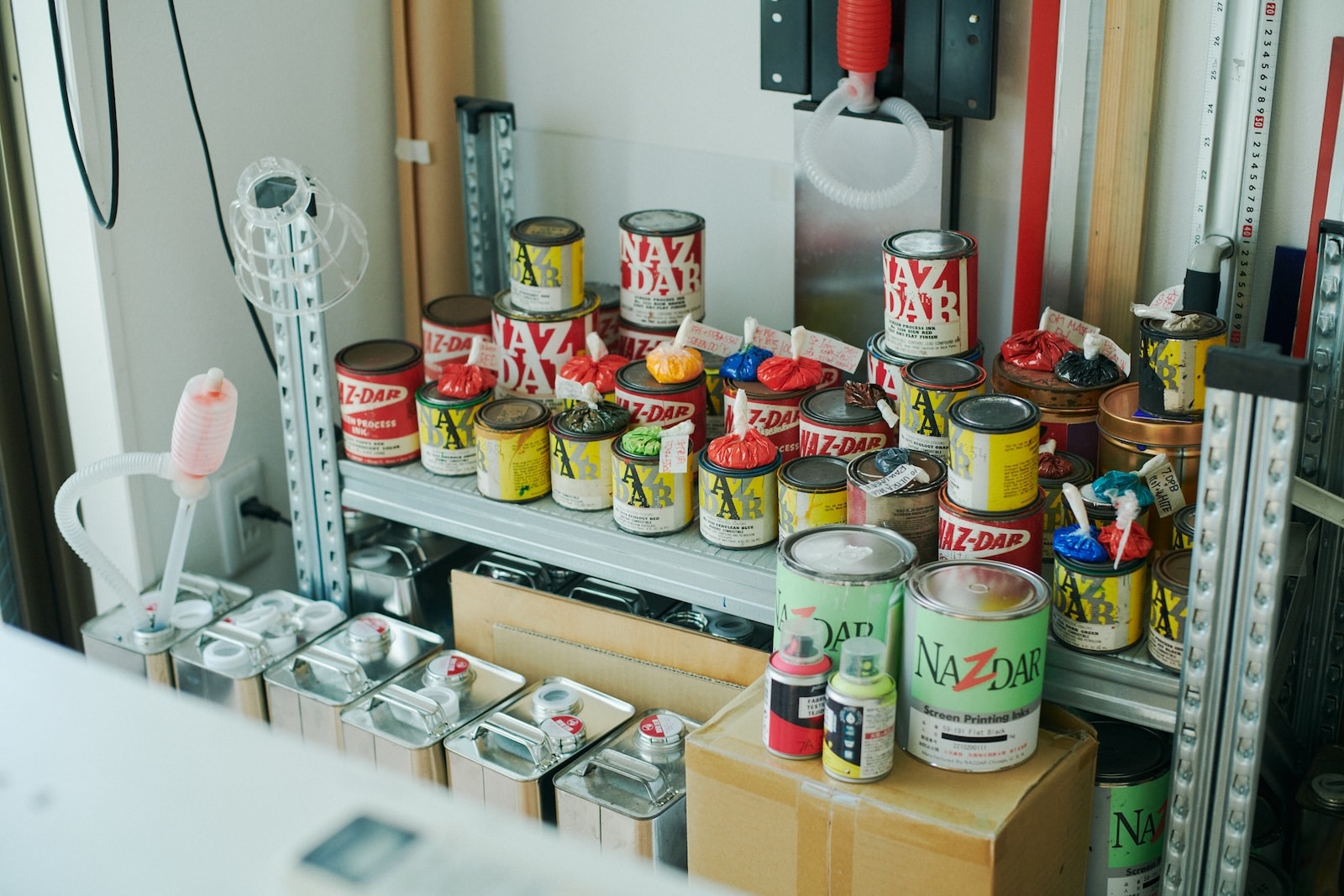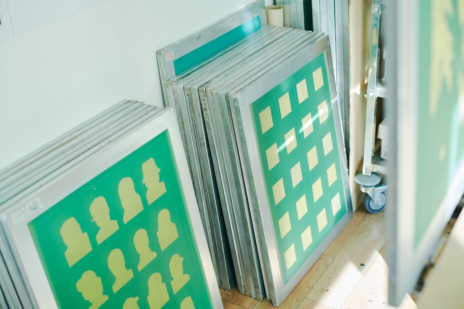 シルクスクリーンに使う塗料と、メッシュ状のシートで作られた版。本多さんのアトリエは、デジタルとアナログな材料が自由に交差するワクワクする空間。