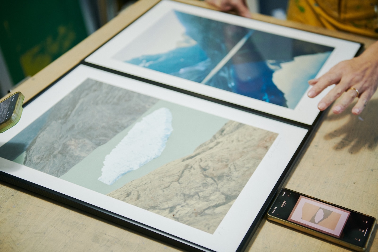 手前は2023年7月の個展「今日はここまで」(PADDLERS COFFEE)にて制作したシルクスクリーンプリント。根本さんの写真から本多さんが感じたという「写真のような絵のようなすごくイイ感じの温度感」を表現するべく、印刷表現の基本であるCMYK4色による分解ではなく、本多さんのディレクションにより7色にまとめた特殊分解でのプリント。奥は、2025年6月の個展「Tramping Te Araroa and more!」(e2 gallery)で発表した9版によるプリント。根本さんの写真作品をシルクスクリーンでプリントする場合、本多さんが写真を選ぶ。パソコン上でどのように版を分けるかを考え、それぞれの版をどのような色で表現するかまで綿密にシミュレーションしてプリントに挑む。何度も試作するうえ、センス、技術、経験が必要なものづくりだ。