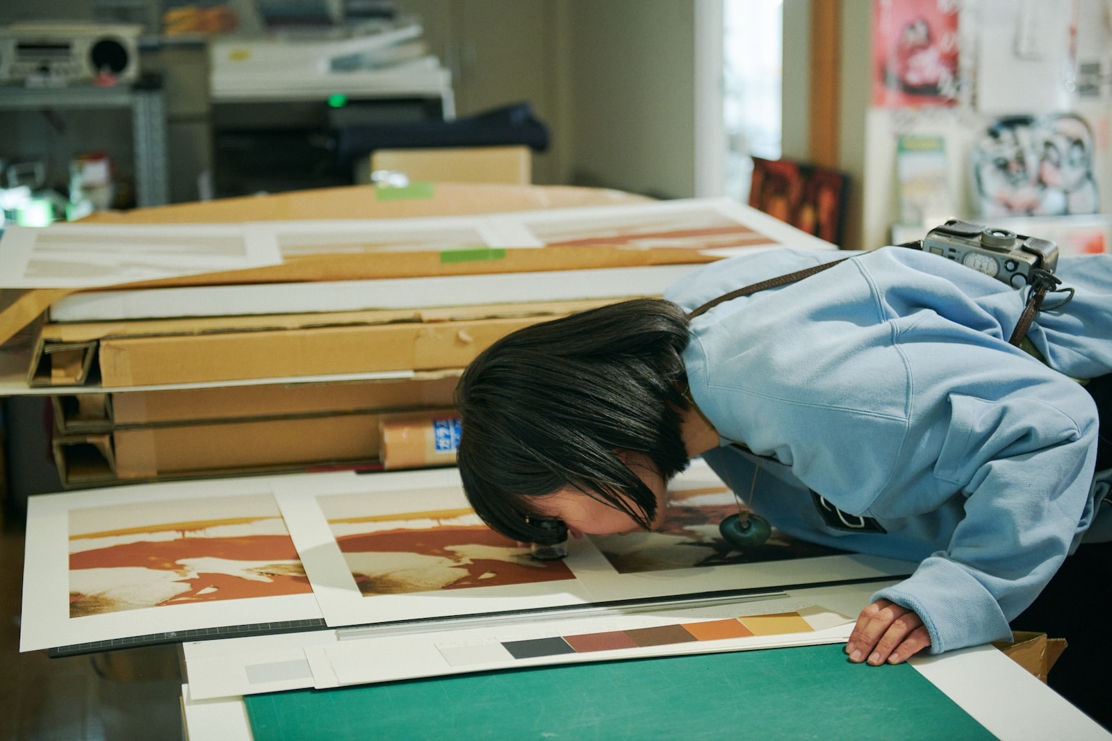 「よくよく近づいて見ると、どのように版、色が重なっているかわかっておもしろいですよ」と本多さんから聞いて、ルーペで刷り上がったものをのぞく根本さん。写真プリントとはちがうシルクスクリーンならではの解釈に、「かっこいい!」とコラボレーションする楽しさと、クオリティの高さに興奮を隠せない。「繊細な表現はオフセット印刷の方が抜群に高いんですよ。シルクスクリーンって、明らかに紙の上にインク・塗料が乗っかっていて質感がある。そうした質感で写真を再現しているのがシルクスクリーンの魅力のひとつかなと思うんです」(本多さん)