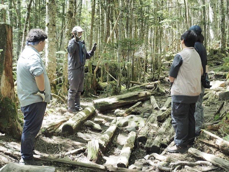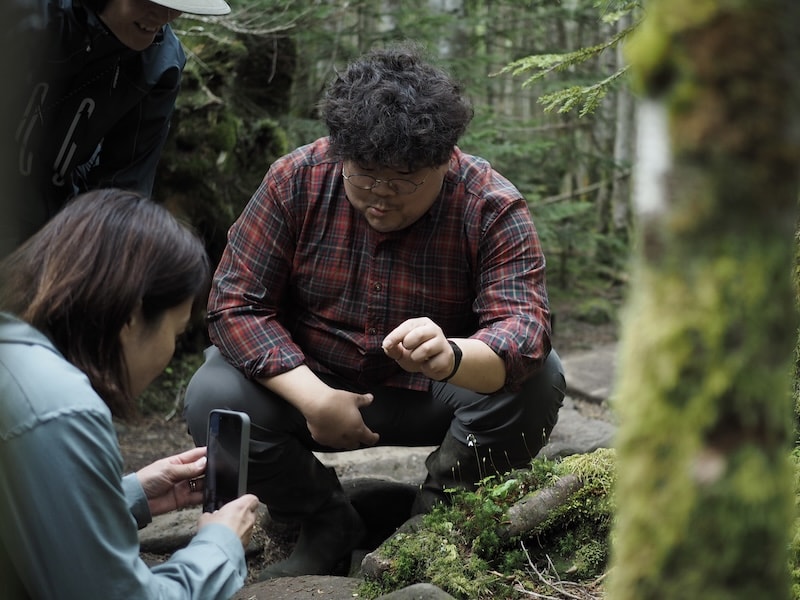 お仕事の合間に特別に周辺を案内してくださった小屋の管理人の木村託さんは、針葉樹は秋になっても葉を落とさないことや、他の植物が根を張れないくらい表土が薄い北八ヶ岳特有の環境が、苔の光合成に適していること、また、豪雨を一因として荒廃が進む登山道の整備の必要性などを教えてくれました。