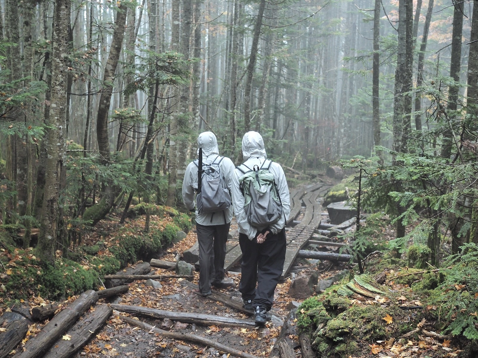 2024年6月。高見石小屋に宿泊した時のハイキングクラブでは、たっぷり水を蓄え、緑を増した美しい苔と、雨水の影響による登山道の荒廃という、雨がもたらす2つの顔に驚かされました。