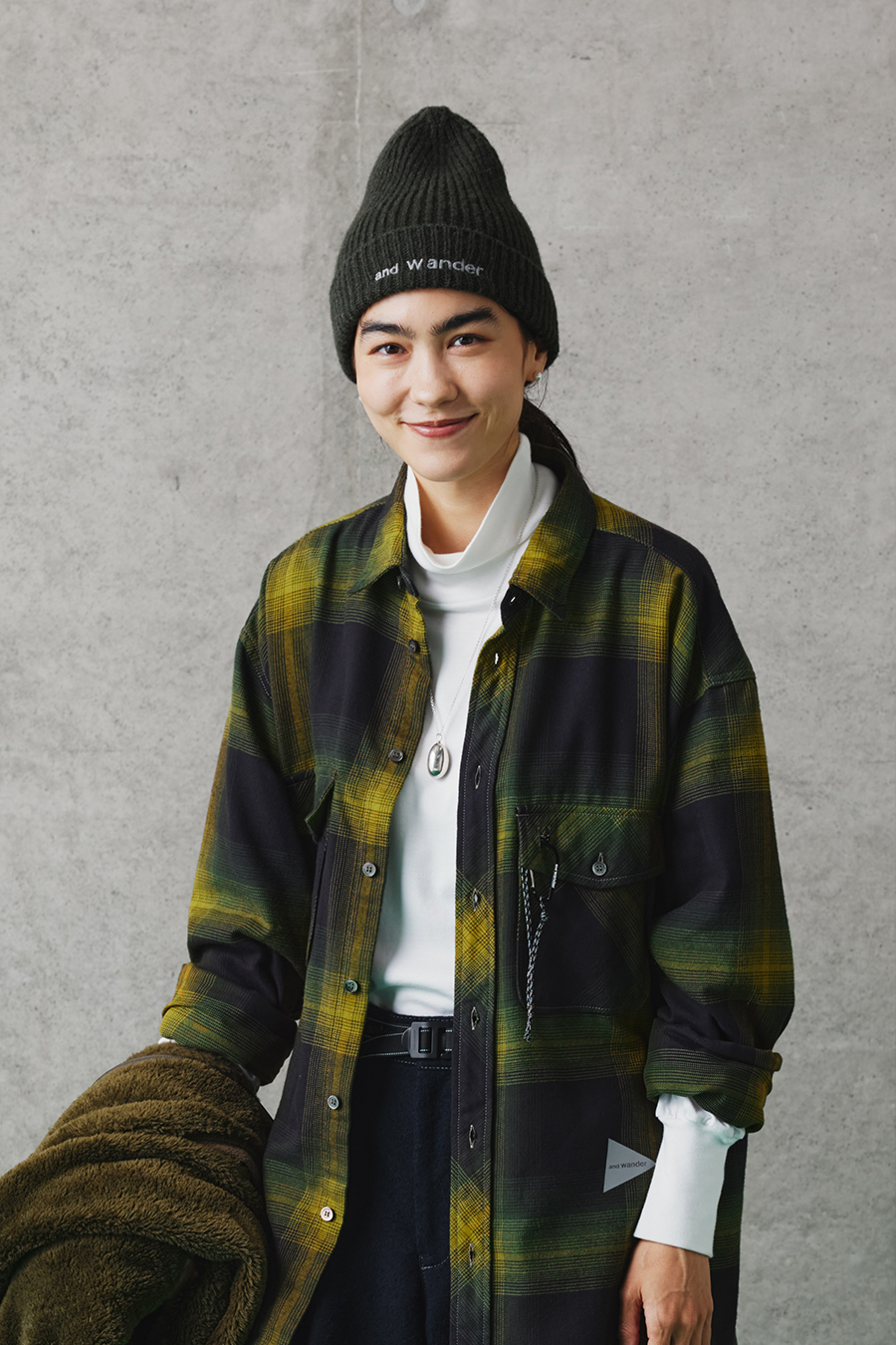「and wanderのウェアのいいところは、ずばり多様性です。小細工せずにサッと羽織っただけのシンプルな着こなしで街に出ても、持ち前の異素材の切り替えしやちょっとしたディテールワークで洗練されたスタイルが演出できるし、そのままアウトドアフィールドに出ても、自然に馴染んで服そのものが持つ機能性というポテンシャルをフルに引き出してくれる本格派にもなる。さらには、帰宅後に着替えて思いっきりリラックスできるルームウェアとしても活躍します。こんなにもマルチ使いのできるウェアは、なかなかないですよね。今回選んだ、『ハイロフトフリース』のシリーズは、そんなマルチウェアとしての要素が満載です」(白男川)